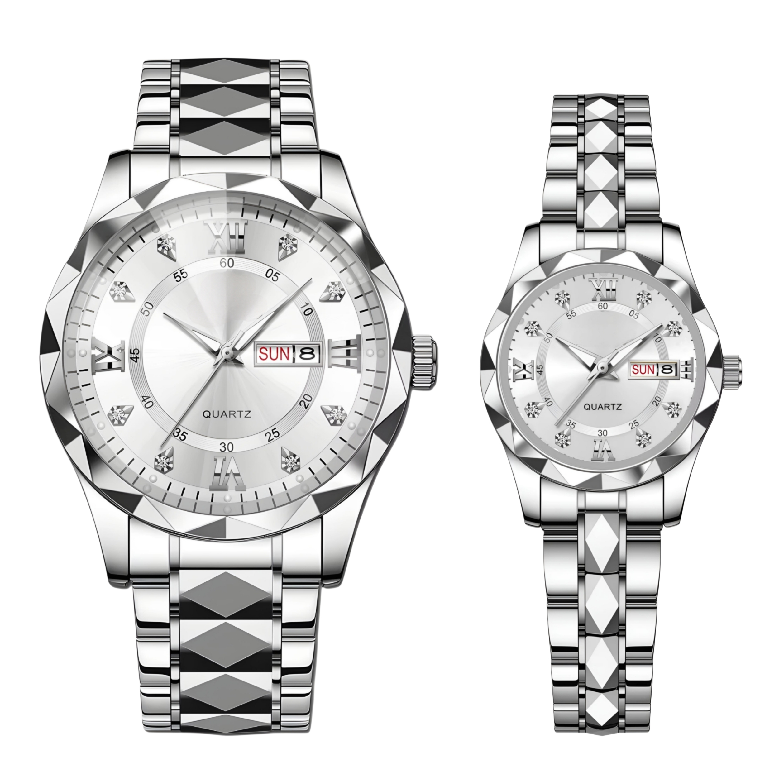 Home ساعت مردانه ست ساعت مچی عقربه‌ای زنانه و مردانه مدل کوارتز کلاسیک دی دیت بند استیل طرح تراش الماسی کد c2.6
